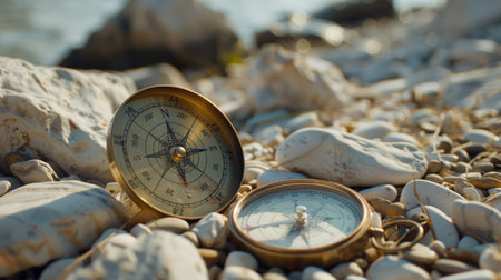A hand holds an open antique compass, showcasing its intricate internal mechanism. The aged brass instrument is positioned near a body of water with rocks. Soft, natural lighting bathes the scene. This image could be used for illustrations related to travel, exploration, or navigational concepts.