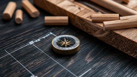 A compass is on a wooden surface with a pile of wooden sticks. The compass is black and gold and is placed on top of a piece of paper