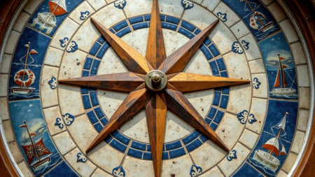 Vintage nautical compass rose with sailboat motifs and ornate blue tiles.
