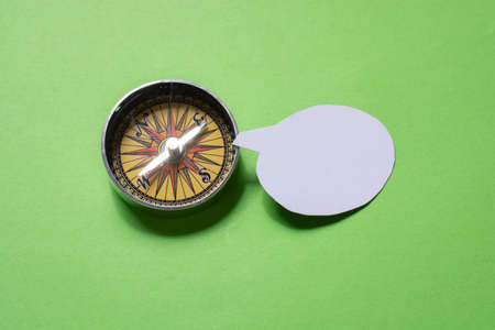Compass on green background. Concept signs symbols. Tool for travel, tourism, science, get lost, business and design and decoration. Flat lay design.
