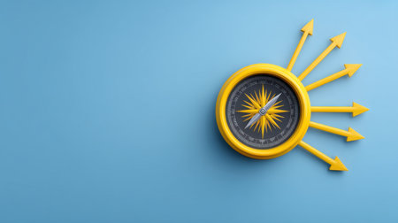 A vibrant yellow compass with directional arrows stands out against a soft blue background, symbolizing navigation, adventure, and the thrill of discovery in travels.