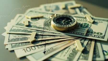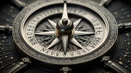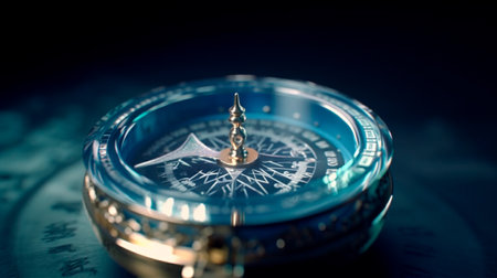 An ancient compass lies on a weathered map, its gleaming needle fixed firmly on a direction, promising adventure and the discovery of hidden treasures and wealth.