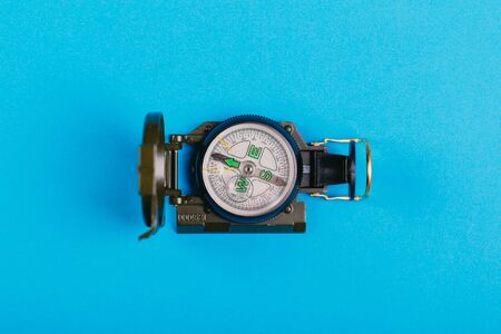 Modern nautical metal tourist compass on a blue background. travel or search concept