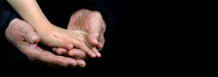 Hands of elderly and young women on black background. Toned.