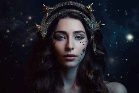 Mystical Woman with a Crescent Moon Crown in a Starry Night
