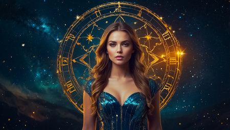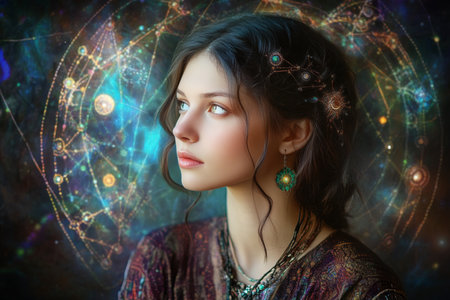 Mystical portrait of a woman seer surrounded by enigmatic zodiac signs and celestial symbols