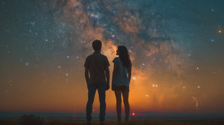 Couple embracing under a starry night sky, marveling at the Leo and Virgo constellations, sharing a moment of love and connection