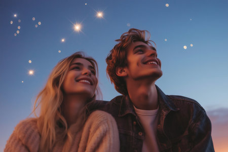 Happy couple enjoying romantic twilight with shooting stars, dreaming and smiling under a beautiful sky
