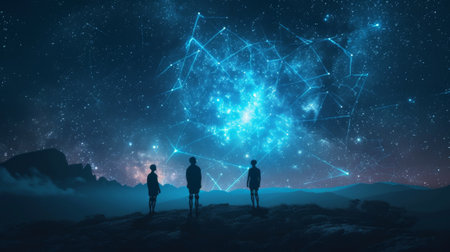 Three people standing on a hill looking at the stars, AI