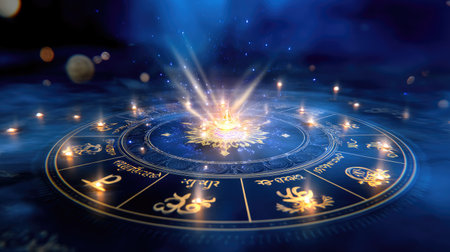 This captivating image features a glowing astrological chart adorned with zodiac signs, surrounded by mystical light and celestial elements, evoking a sense of wonder.