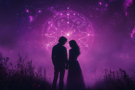 Wedding couple in love with astrological symbols on background