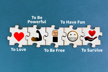 wooden puzzle with icons to love and belong, to be powerful, to be free, to have fun and to survive. What is the 5 basic needs theory?