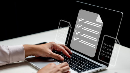 Businessman using a laptop while showing a questionnaire with a checkmark icon on the screen. Technology innovation on a virtual screen. Concept of online exam questionnaire