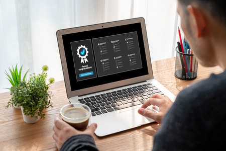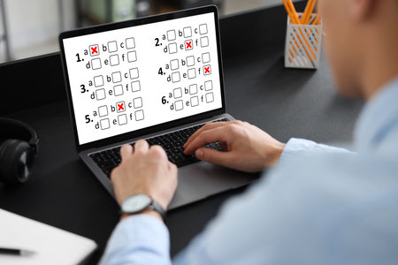 Man passing online test on laptop at table, closeup
