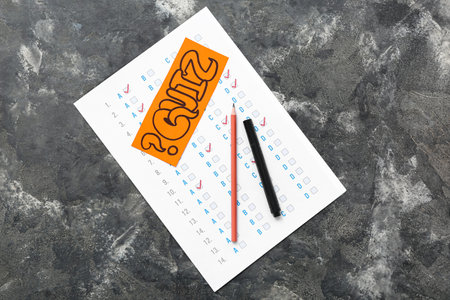 Quiz form with card, marker and pencil on grunge black background