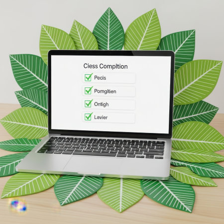 The image shows a laptop surrounded by green leaves, displaying a screen with a 'Class Completion' title and a list of checked names including Pecls, Pomglitien, Ontigh, and Lavier.