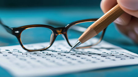 Exam. Filling in the test with a pencil.