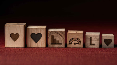 A creative arrangement of wooden blocks featuring heart symbols and graphical icons, set against a dark background. Perfect for themes of love, measurement, and design.