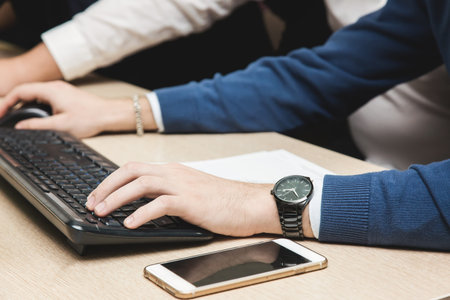 students perform the task or office managers work together at the computer. close-up.
