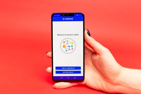 26 08 2019 Tula: Coinomi on the phone display. Logo