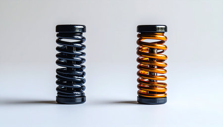 Two distinct industrial coil springs, one black and one amber, stand side-by-side, representing choice and comparison in mechanical design.