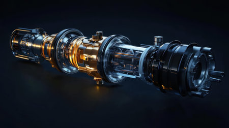 A futuristic engine component showcasing intricate design and precision, isolated on a black backdrop.