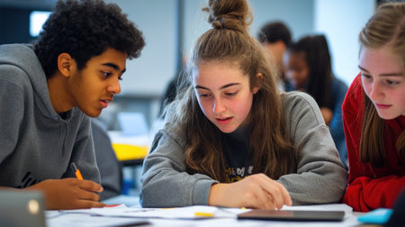 Group of young students sitting at desk in classroom and working together.