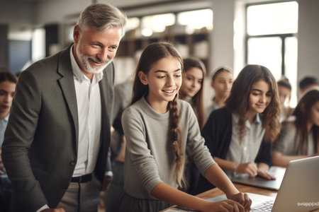 Senior male teacher working on a laptop with children in a classroom. Generative AI