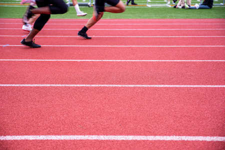 Close-up of athletes running on the race track. Group of runners on a race track.