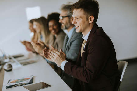 Multiethnic group of business people working together and applauding in after succesful meeting in the office