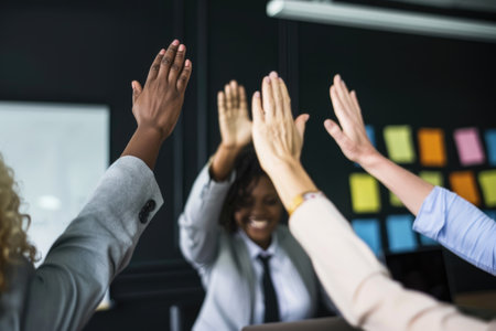 A diverse team of business professionals ecstatically celebrating their success in a modern office, expressing triumph and unity after achieving their goals