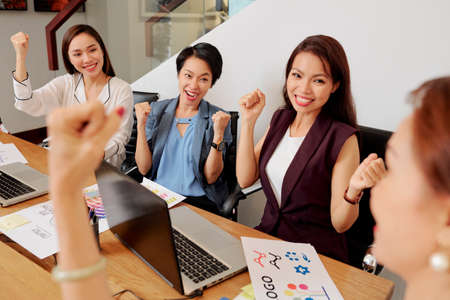 Happy Asian businesswomen sitting at the table with their female leader during a business meeting and celebrating their success