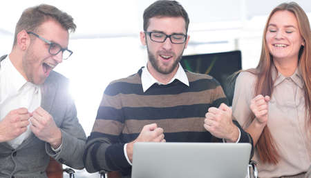 Excited male colleagues gesturing YES, celebrating business success, looking at laptop screen in office, copy space