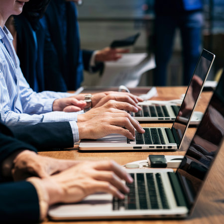 A group of professionals actively engaged in a team meeting, sitting at a table with laptops and whiteboards, fostering collaboration and focus.