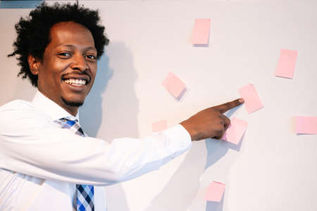 African american man in casual wear standing near the glass office wall with financial points, explaining planning and business strategies to colleagues, creative solutions on brainstorming session.