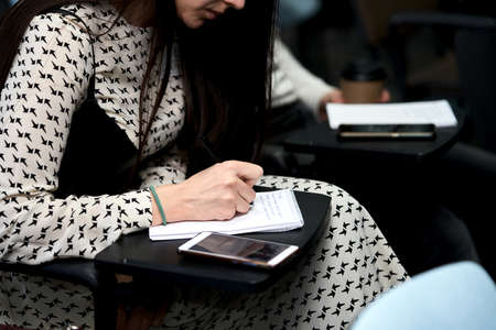 2016.01.17 Business school training in the Samara. Group of People have Meetings. Hands working with books, laptops, pens. From above view.