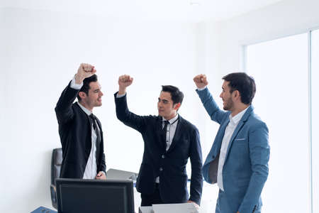 business people raising hands celebrating success in office, rejoicing at victory, booming business, compant has earned much money, happiness, well doen, good job, emotion, feeling, reaction