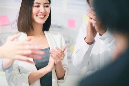 successful business presentation smart asian business woman presenter hand applause with coworker and friend office meeting background
