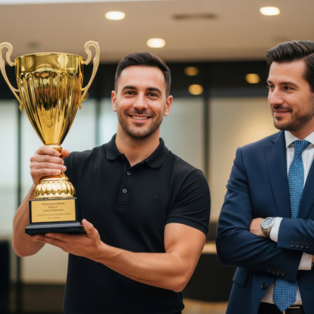 A smiling man in a black polo shirt stands in a modern office environment, proudly holding a large, shiny gold trophy. To his right, a colleague in a blue suit and tie looks on with a supportive smile. The scene captures a moment of professional recognition and celebration, symbolizing success, achievement, and teamwork within a corporate setting.
