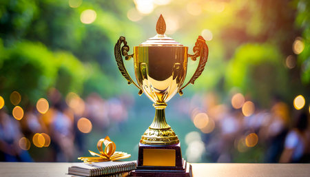 A golden trophy cup with confetti on table and glowing bokeh lights background, symbolizing achievement and celebration