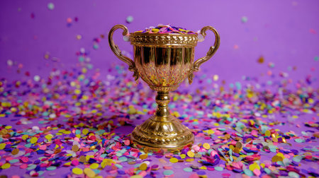 A shiny golden trophy with a black base is centered on a purple surface, surrounded by a vibrant cascade of falling confetti.