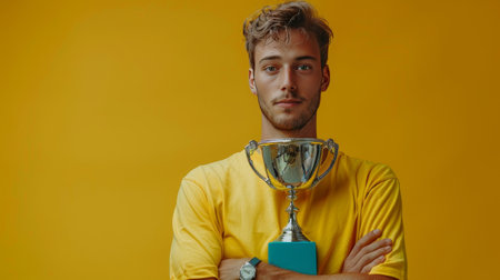 A vibrant celebration scene featuring a person holding a golden trophy high in the air, surrounded by cheering crowd and sparkling confetti.