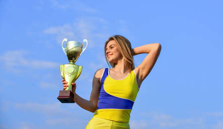 Winner in competition. Sport and health. Adorable cup winner. Sport and competition concept. girl is happy. she is champion. Girl Reacting on Winning a Trophy. motivation. congratulations on success