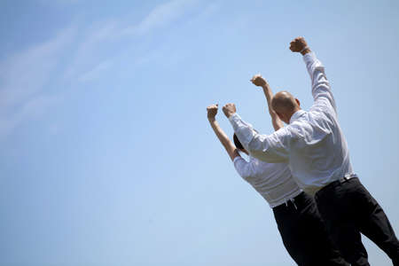 A diverse group of successful businessmen raises their hands in the air, symbolizing achievement, accomplishment, and the fulfillment of goals, exuding confidence, unity, and celebration of their collective success.