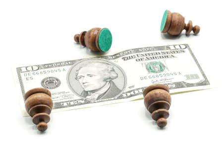 Business Or Society Concept, Money Rules: Four Defeated Black Pawn Chess Pieces Lying Around A 10 Dollars Banknote, Isolated On White Background