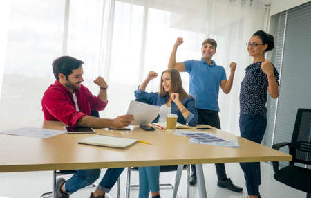 Successful business people team celebrating project success at office. Team winner and collaboration achievement concept.