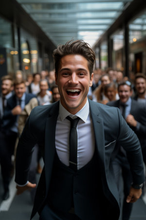Successful happy businessman stands in the foreground with his enthusiastic team cheering and celebrating in the background, symbolizing collective success and achievement.