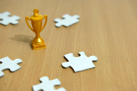 Business strategy conceptual photo – Silhouette of trophy stand in the middle of jigsaw puzzle