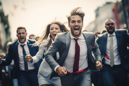 Corporate marathon triumph: businesspeople group in suits crossing finish line, embodying struggle for success, determination, and teamwork in the competitive world of business and beyond.