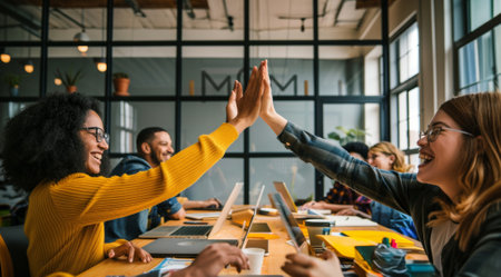 Energetic Team Celebrating Success with a High Five in a Bright, Modern Office Space.